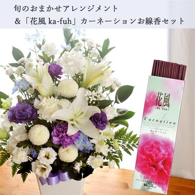 お供え花と線香のセット お供えアレンジlサイズ 白 青紫系 と花風線香 カーネーション 線香 生花 アレンジメント 籠花 お悔み お供え 送料無料 喪中見舞 お盆 お彼岸 Flowerkitchen Jre Pointが 貯まる 使える Jre Mall