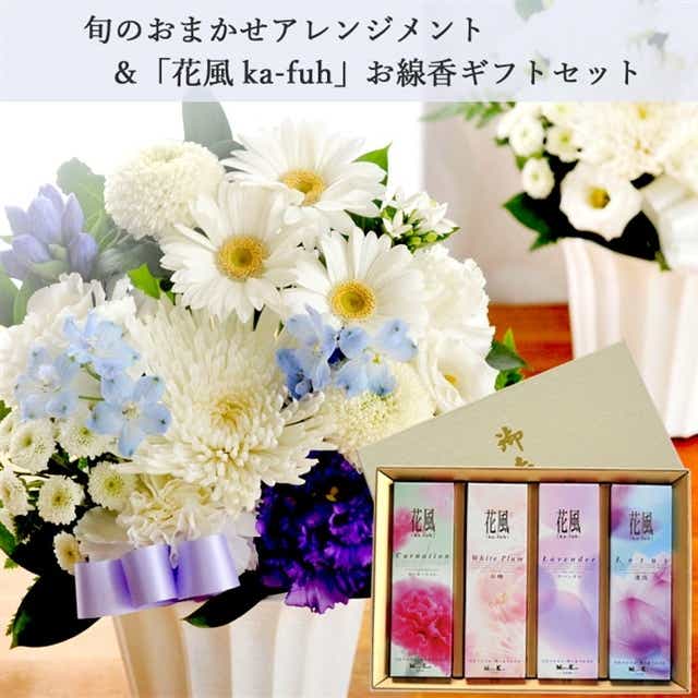 お供え花と線香のセット お供えアレンジsサイズ 白 青紫系 と花風線香4種ギフトセット 線香 生花 アレンジメント 籠花 お悔み お供え 送料無料 喪中見舞 お盆 お彼岸 Flowerkitchen Jre Pointが 貯まる 使える Jre Mall